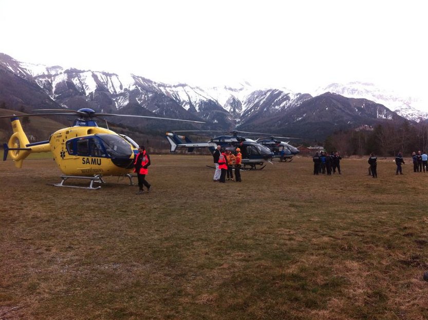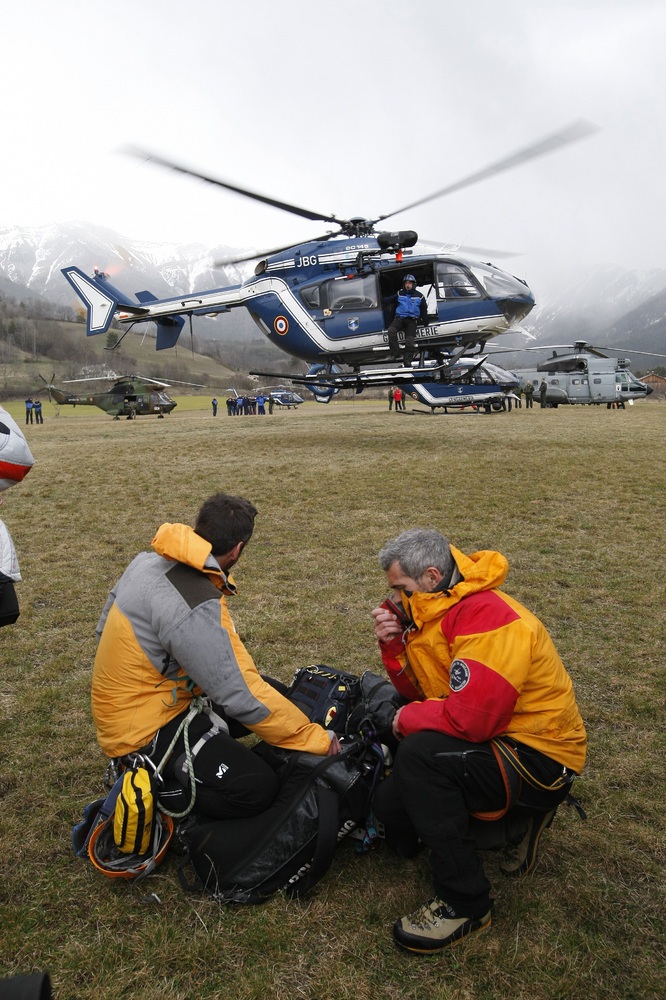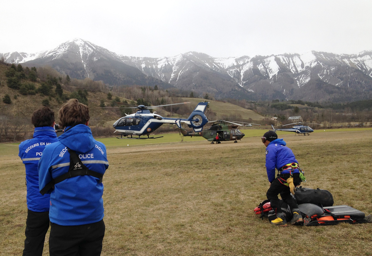 Rescue workers and gendarme gather as a helicopter takes off from Seyne-les-Alpes, French Alps, Tuesday, March 24, 2015, as search-and-rescue teams struggle to reach the remote crash site of Germanwings passenger plane. A Germanwings passenger jet carrying 150 people crashed Tuesday in the French Alps as it flew from Spain's Barcelona airport to Duesseldorf in Germany, authorities said.(AP Photo/Claude Paris)