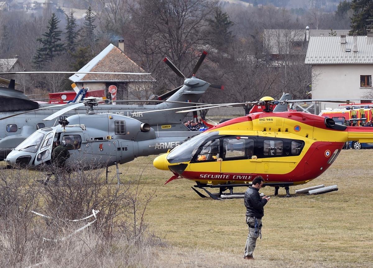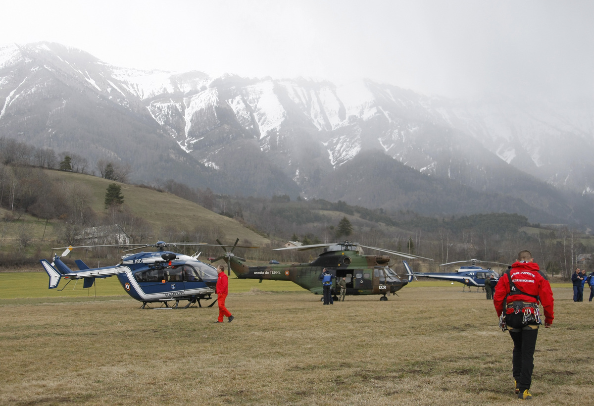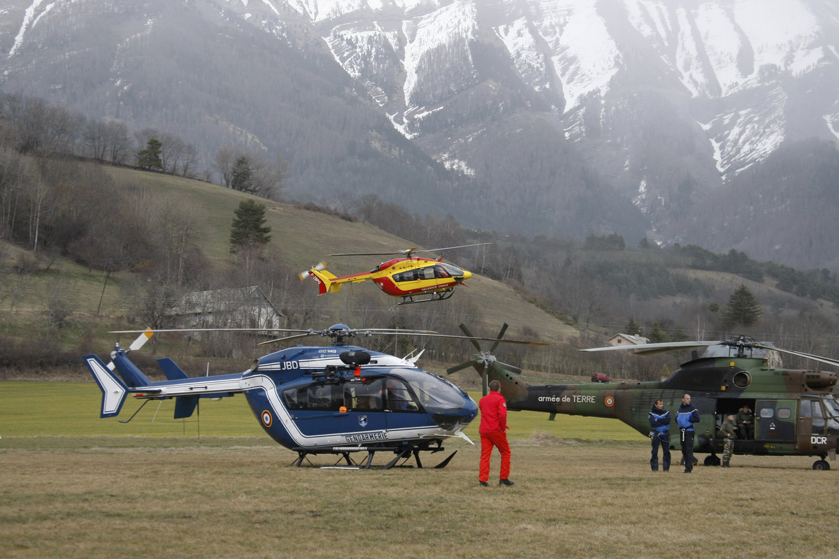 Helicopters of the French Air Force (back) and civil security services are seen in Seyne, south-eastern France, on March 24, 2015, near the site where a Germanwings Airbus A320 crashed in the French Alps. A German airliner crashed near a ski resort in the French Alps on March 24, killing all 150 people on board, in the worst plane disaster in mainland France in four decades. AFP PHOTO / BORIS HORVAT (Photo credit should read BORIS HORVAT/AFP/Getty Images)