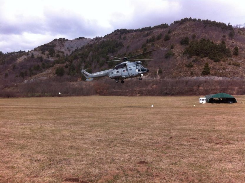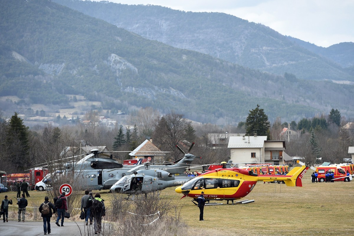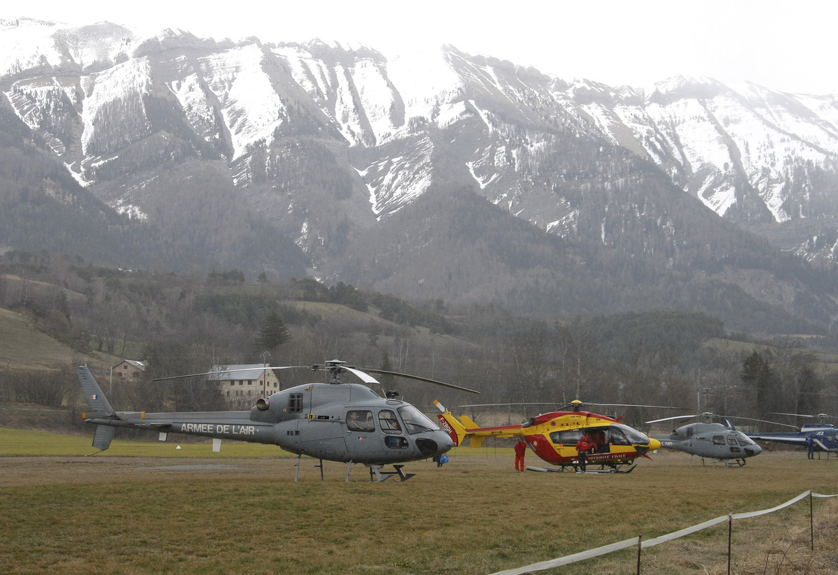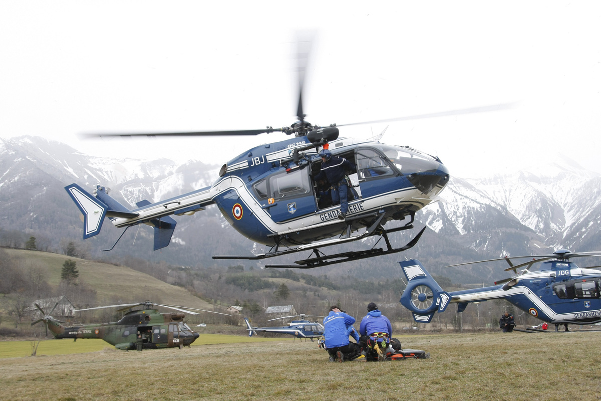 Helicopters of the French Air Force (back) and civil security services are seen in Seyne, south-eastern France, on March 24, 2015, near the site where a Germanwings Airbus A320 crashed in the French Alps. A German airliner crashed near a ski resort in the French Alps on March 24, killing all 150 people on board, in the worst plane disaster in mainland France in four decades. AFP PHOTO / BORIS HORVAT (Photo credit should read BORIS HORVAT/AFP/Getty Images)