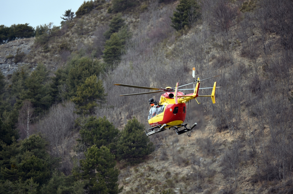 A helicopter of the French civil security services flies near Seyne, south-eastern France, on March 24, 2015, near the site where a Germanwings Airbus A320 crashed in the French Alps. A German airliner crashed near a ski resort in the French Alps on March 24, killing all 150 people on board, in the worst plane disaster in mainland France in four decades.. AFP PHOTO / ANNE-CHRISTINE POUJOULAT (Photo credit should read ANNE-CHRISTINE POUJOULAT/AFP/Getty Images)