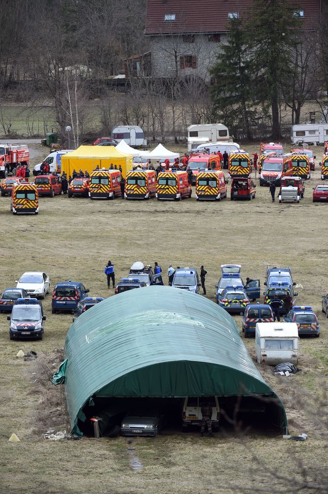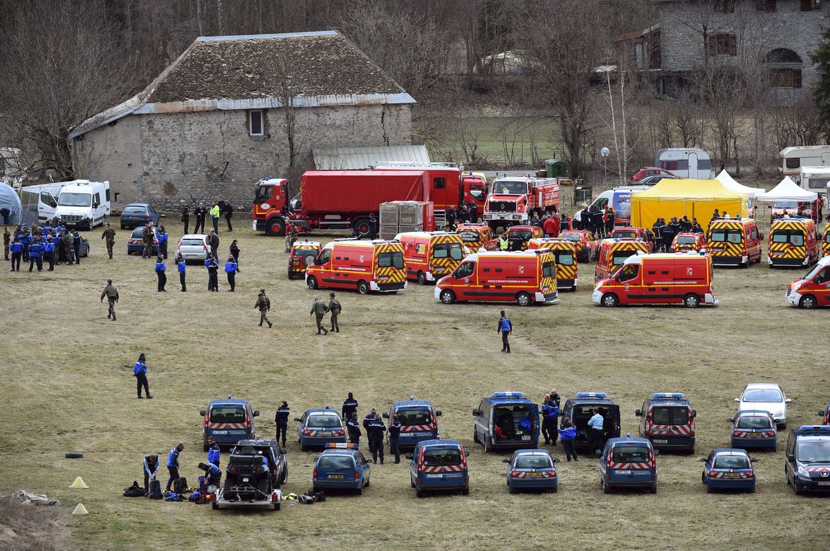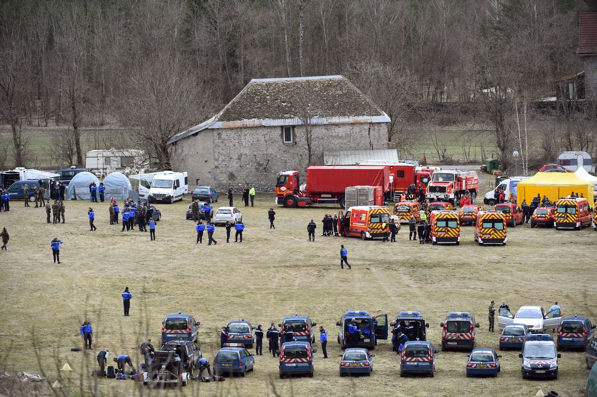 French emergency services workers (back) and members of the French gendarmerie gather in Seyne, south-eastern France, on March 24, 2015, near the site where a Germanwings Airbus A320 crashed in the French Alps. A German airliner crashed near a ski resort in the French Alps on March 24, killing all 150 people on board, in the worst plane disaster in mainland France in four decades. AFP PHOTO / BORIS HORVAT (Photo credit should read BORIS HORVAT/AFP/Getty Images)