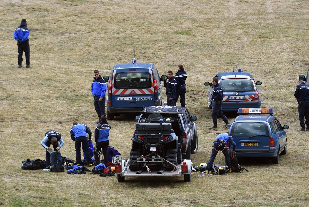 Members of the French gendarmerie gather in Seyne, south-eastern France, on March 24, 2015, near the site where a Germanwings Airbus A320 crashed in the French Alps. A German airliner crashed near a ski resort in the French Alps on March 24, killing all 150 people on board, in the worst plane disaster in mainland France in four decades. AFP PHOTO / BORIS HORVAT (Photo credit should read BORIS HORVAT/AFP/Getty Images)