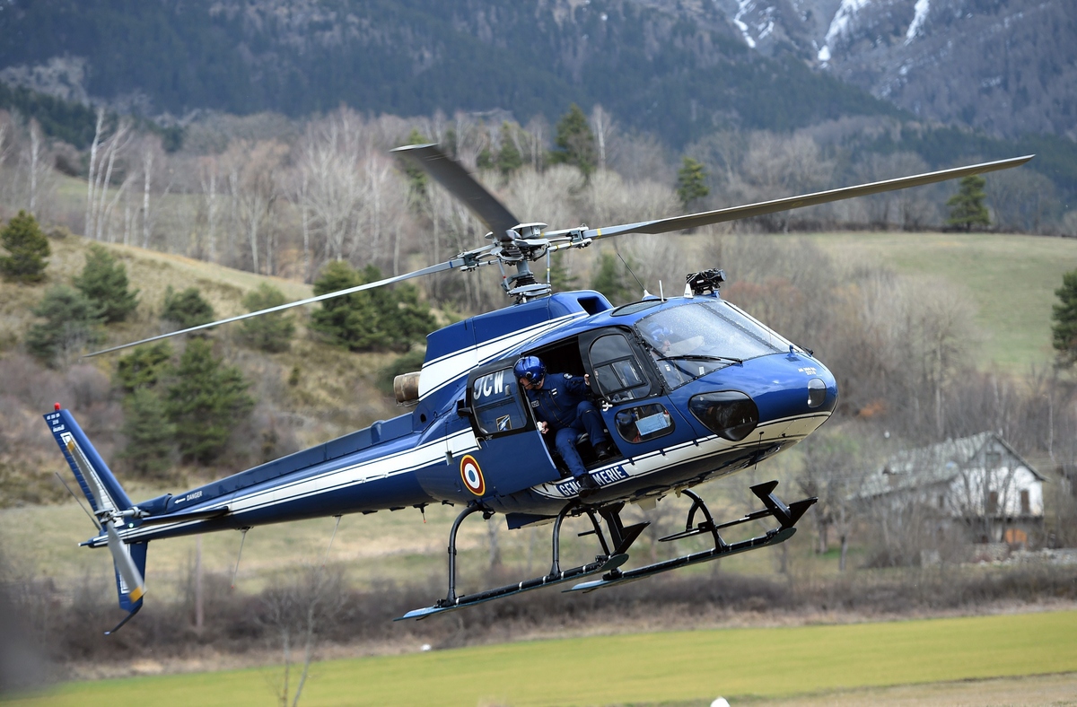 An Aerospatiale AS350 Ecureuil helicopter of the French National Gendarmerie is seen in Seyne, south-eastern France, on March 24, 2015, near the site where a Germanwings Airbus A320 crashed in the French Alps. A German airliner crashed near a ski resort in the French Alps on March 24, killing all 150 people on board, in the worst plane disaster in mainland France in four decades. AFP PHOTO / ANNE-CHRISTINE POUJOULAT (Photo credit should read ANNE-CHRISTINE POUJOULAT/AFP/Getty Images)