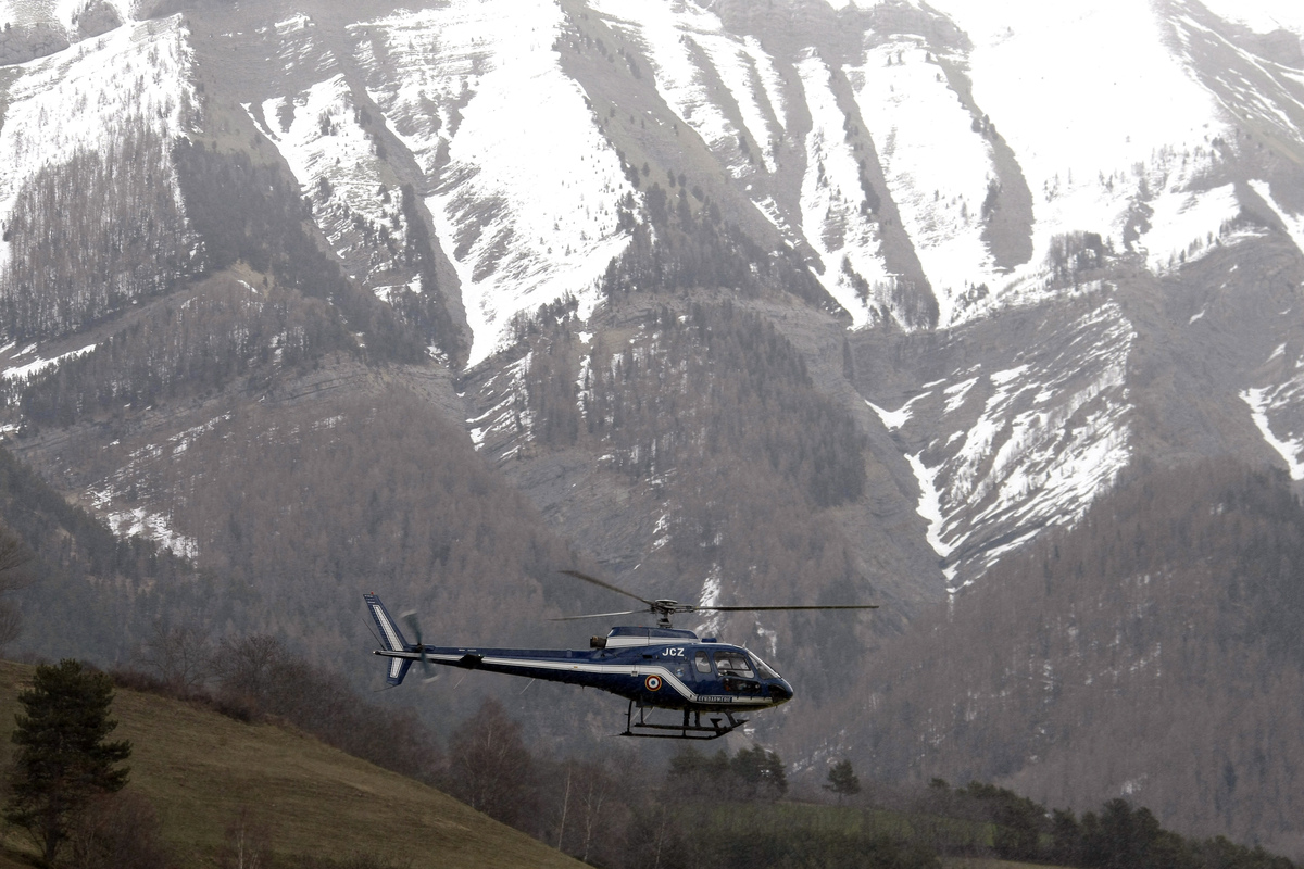 A rescue helicopter flies near Seyne-les-Alpes, French Alps, Tuesday, March 24, 2015, as search-and-rescue teams struggle to reach the remote crash site of Germanwings passenger plane. A Germanwings passenger jet carrying 150 people crashed Tuesday in the French Alps as it flew from Spain's Barcelona airport to Duesseldorf in Germany, authorities said. (AP Photo/Claude Paris)