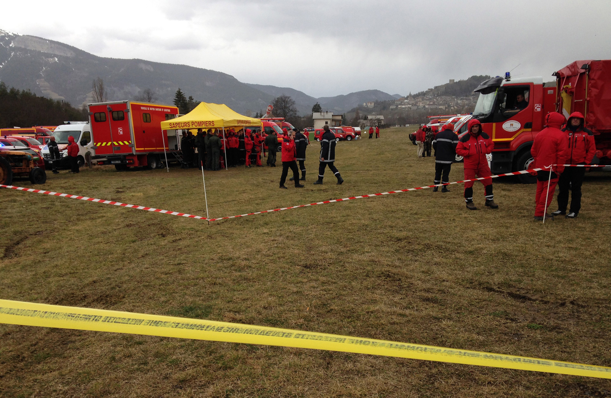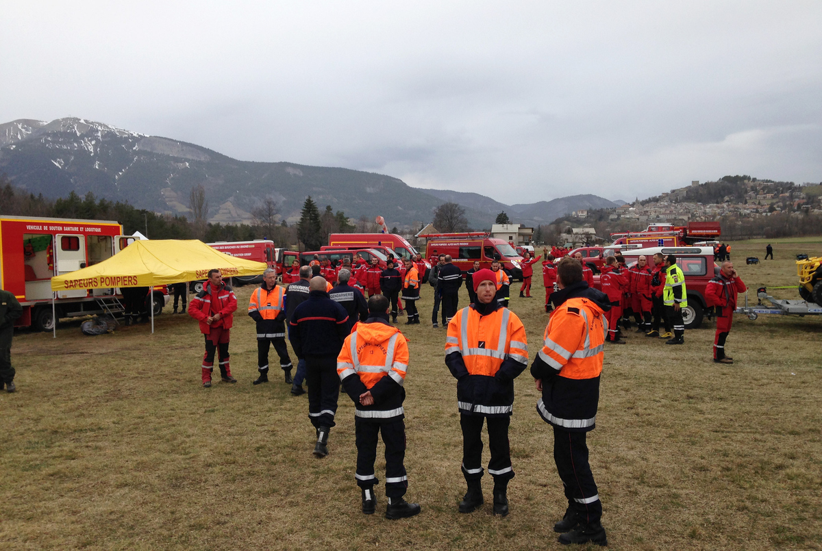French emergency services workers gather in Seyne, south-eastern France, on March 24, 2015, near the site where a Germanwings Airbus A320 crashed in the French Alps. A German airliner crashed near a ski resort in the French Alps on March 24, killing all 150 people on board, in the worst plane disaster in mainland France in four decades. AFP PHOTO / BORIS HORVAT (Photo credit should read BORIS HORVAT/AFP/Getty Images)