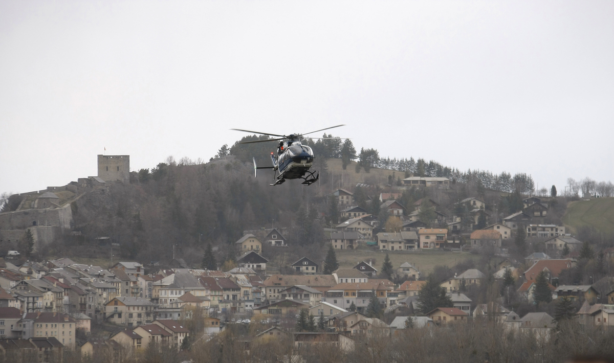 A rescue helicopter flies over Seyne-les-Alpes, French Alps, Tuesday, March 24, 2015, as search-and-rescue teams struggle to reach the remote crash site of Germanwings passenger plane. A Germanwings passenger jet carrying 150 people crashed Tuesday in the French Alps as it flew from Spain's Barcelona airport to Duesseldorf in Germany, authorities said. (AP Photo/Claude Paris)