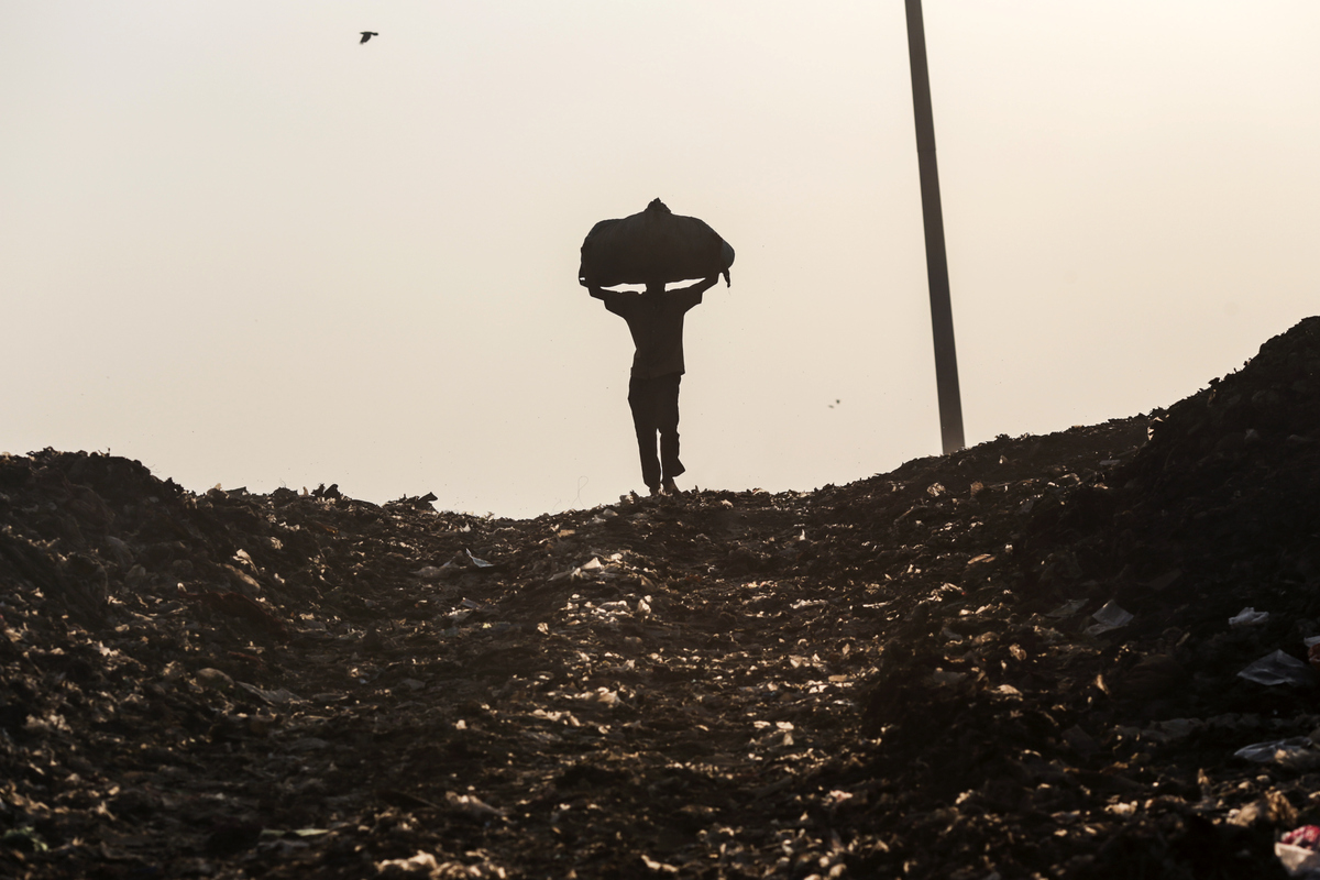 A rag picker carries a sack of sorted recyclable materials collected from garbage on his head at the Deonar landfill site in Mumbai, India, on Wednesday, March 11, 2015.